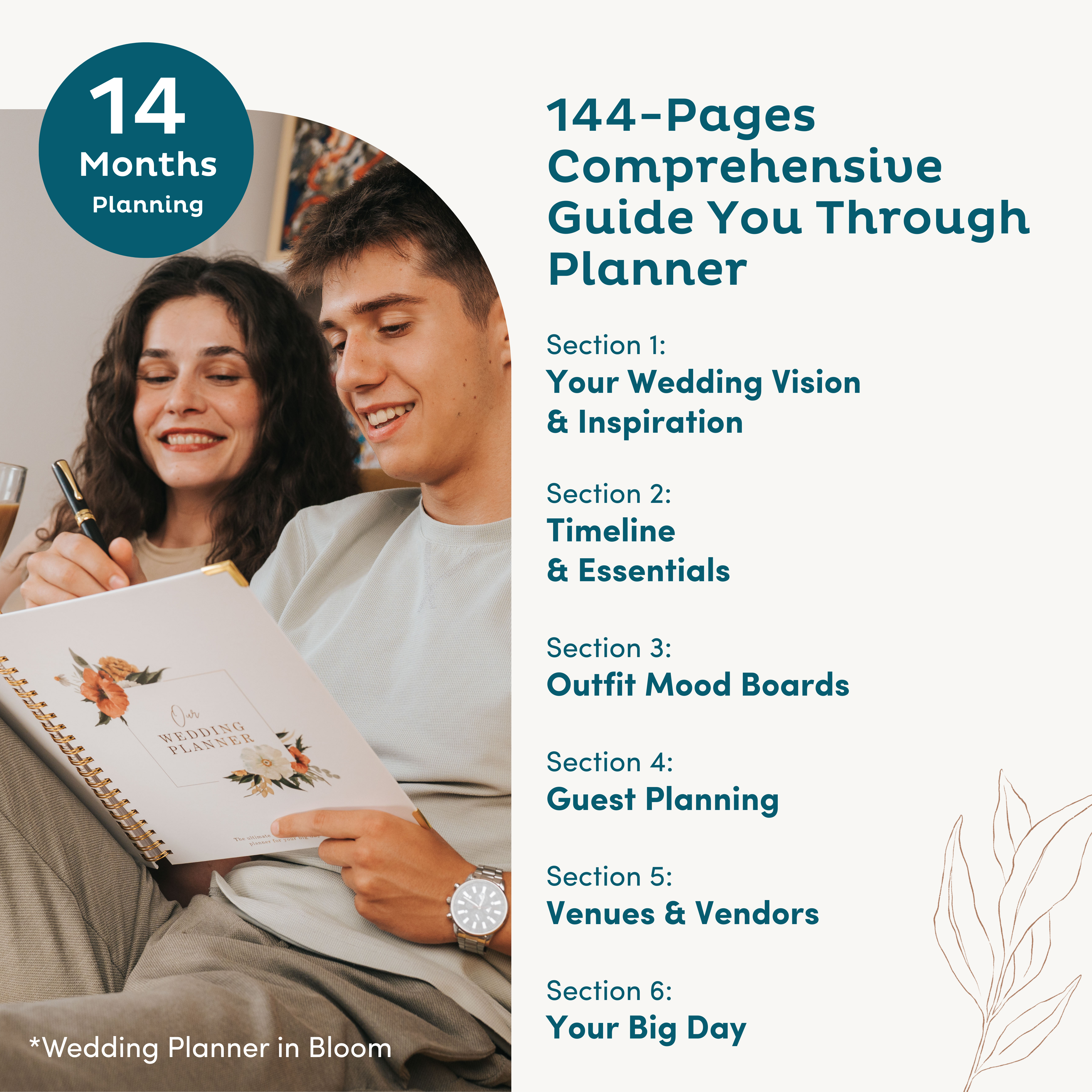 Our planner is complete with checklists for each milestone plus 14 months of calendars to count down with you every step of the way. Having the Nook Theory Wedding Planner is as if having a private wedding consultant with you, but even better. From the important things, like selecting a venue, to all the tiny little details that can be easily forgotten and often missed out. It is packed full of handy hints and tips, it will almost definitely remind you of things you didn't realize were needed.