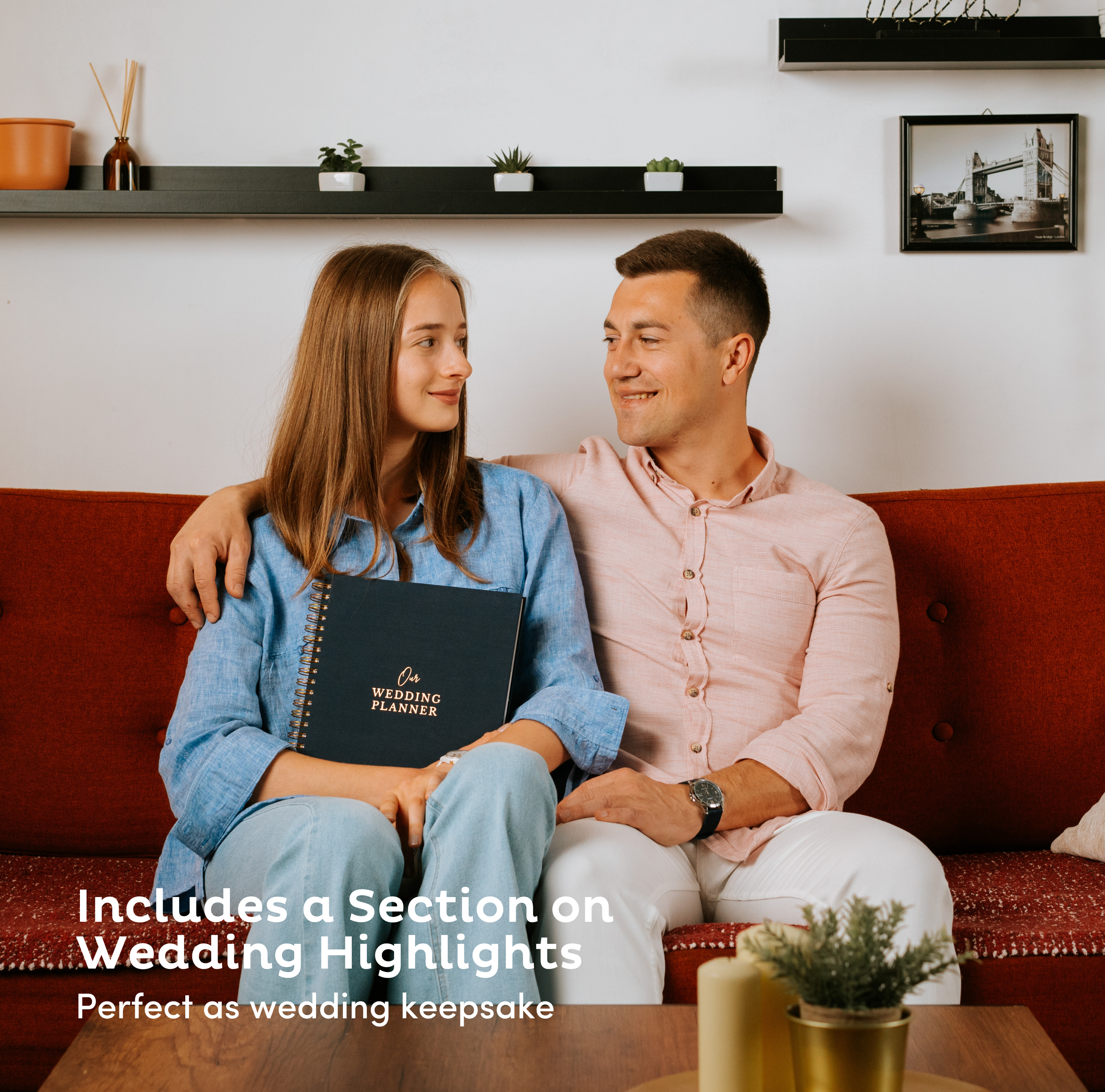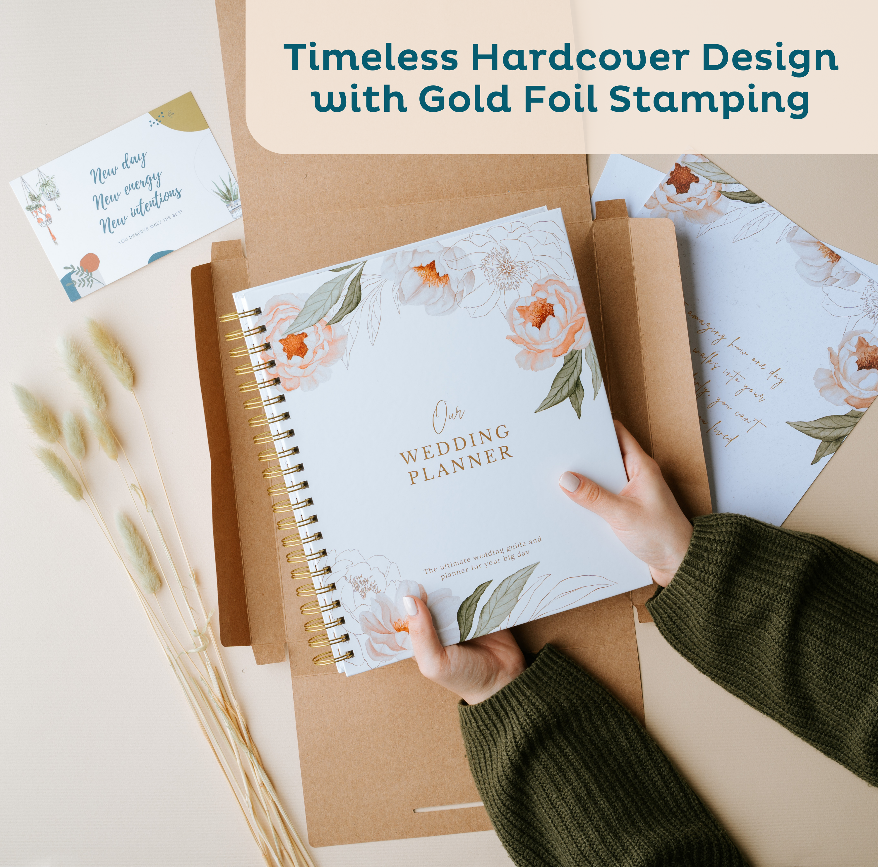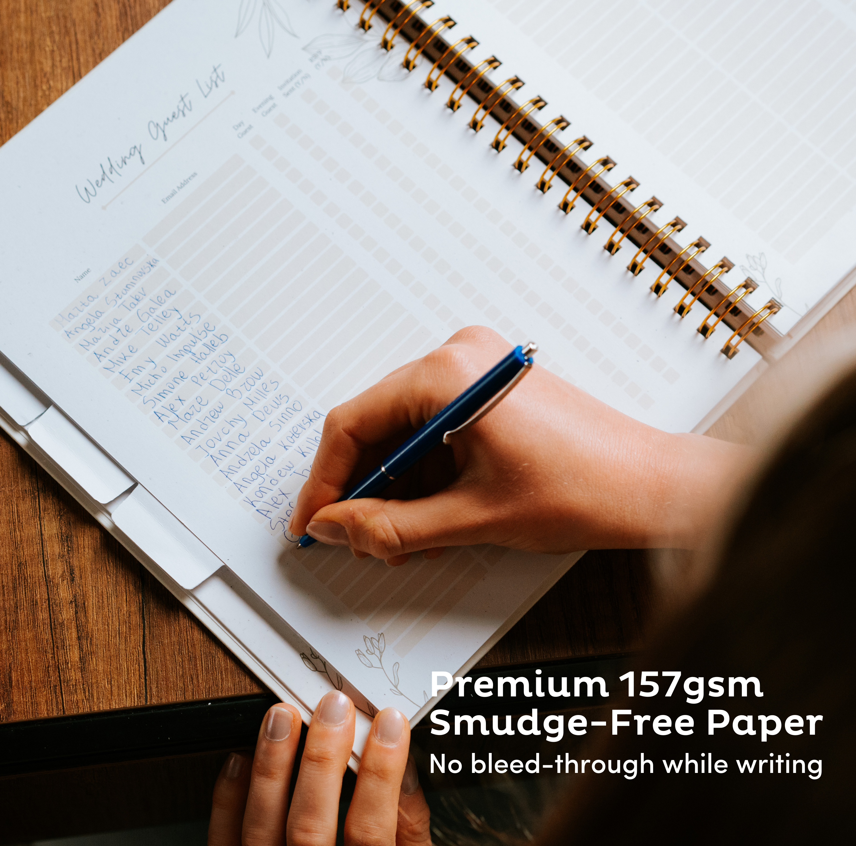 144 pages of quality wedding planner book to help you plan your perfect day in a breeze. Large 9”x11” with elegant hardcover plus gold foil stamping. High-quality 153 gsm smudge-free paper, no bleed-through while writing.