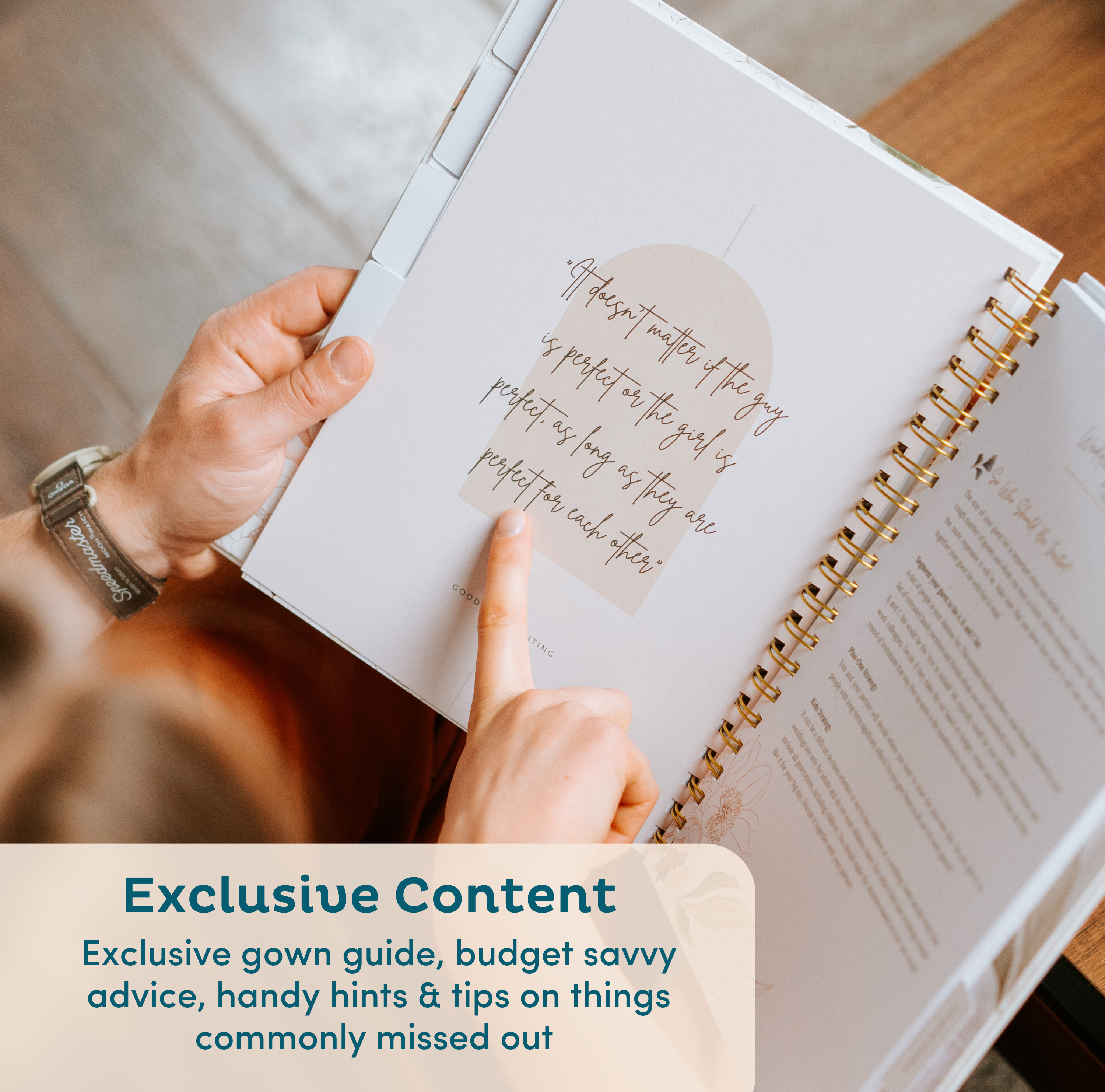 Our wedding planner features exclusive content that is only available in our planner. This includes the gown guide, budget-savvy advice, and even a list of useful questions to ask each of your vendors.